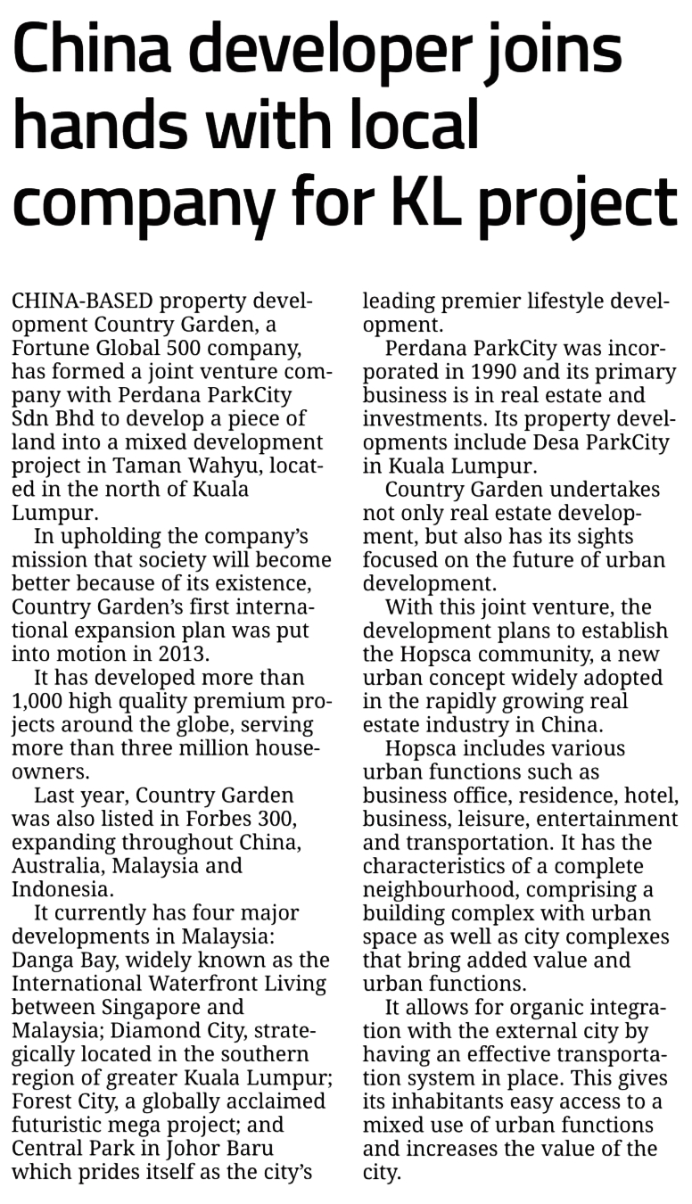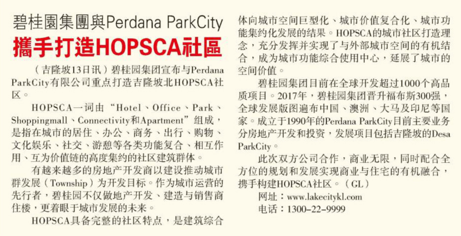 Joint Venture Announcement press release was published on The Star, The Edge Property, The Edge Markets, Sin Chew Daily and China Press by the second week of April 2018. Destined to inspire and rejuvenate the thriving KL North, a one-of-a-kind urban HOPSCA city awaits you.